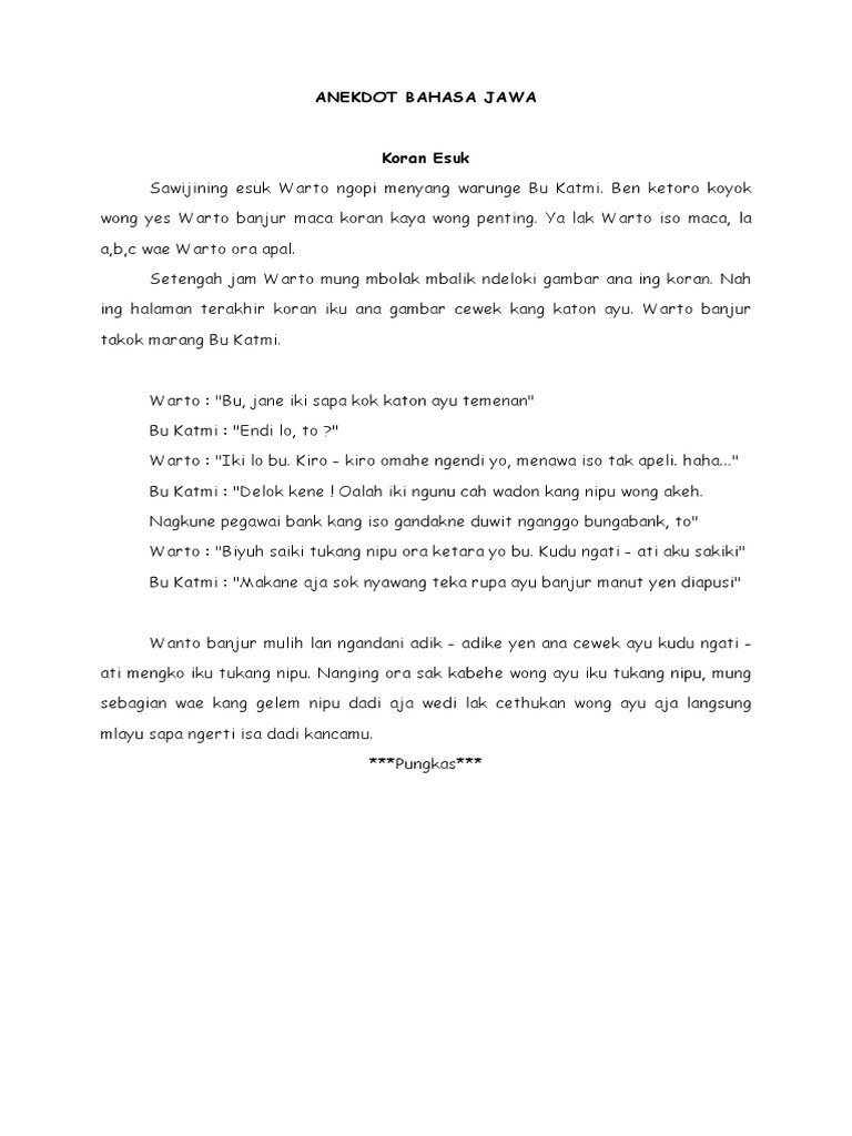 Makanya, teks anekdot yang sering dibuat selalu seputaran layanan publik. Demikian informasi yang dapat kami bagikan mengenai contoh teks pawarta dalam bahasa jawa. Menurut kamus besar bahasa indoensia, anekdot adalah cerita singkat yang menarik karena lucu dan mengesankan, biasanya mengenai orang penting atau. Di dalam sebuah kelas sedang terjadi kegiatan belajar mengajar, di mana sang guru melakukan tanya jawab sahrul pun langsung menghapus foto tersebut dari akun instagrammnya. Teks anekdot kerep asmane tokoh utawa wong penting.